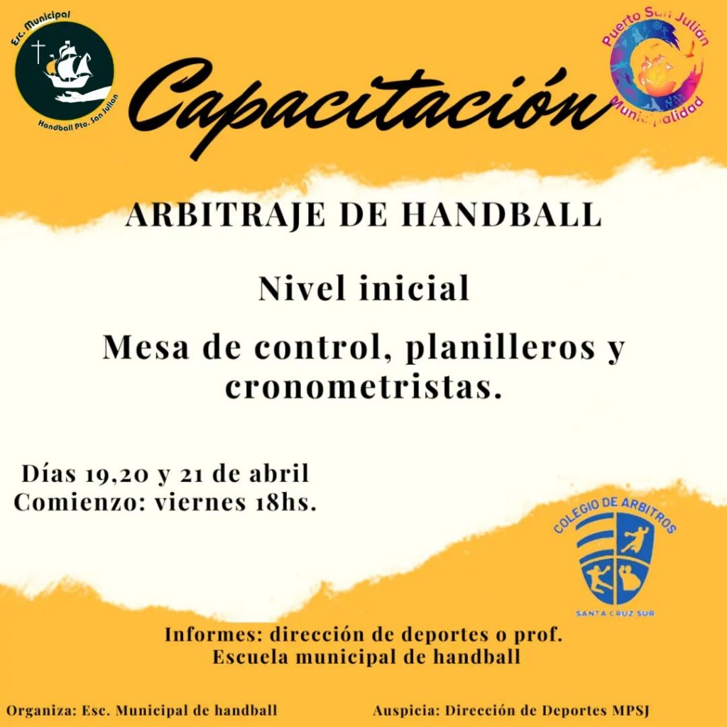 Importante capacitación Arbitraje de Handball este fin de semana en Puerto San Julián. Está destinada a jugadores, técnicos, profesores y aficionados al handball. Es dictada por el árbitro Nacional Rubén Amarilla los días 19, 20 21 de abril. Comprende el nivel inicial, mesa de control, planilleros y cronometristas y va dar comienzo el viernes 18 horas.